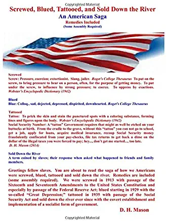 Here and in my book I dissect how we Americans were screwed, blued, tattooed and sold down the river. Remedies are included (some assembly required). We were screwed in 1913 with passage of the Sixteenth and Seventeenth Amendments to the United States Constitution and especially by passage of the Federal Reserve Act; blued starting in 1929 with the so-called “Great Depression;” tattooed in 1935 with passage of the Social Security Act and sold down the river ever since with the covert establishment and implementation of a socialist form of government.